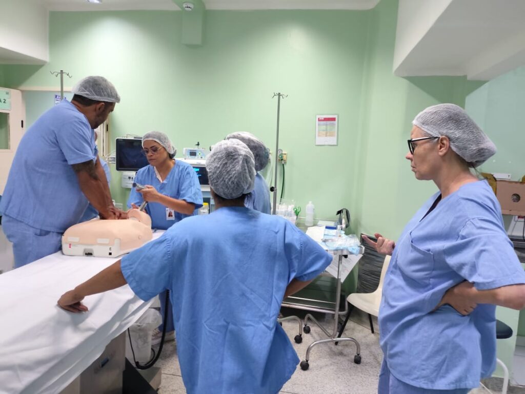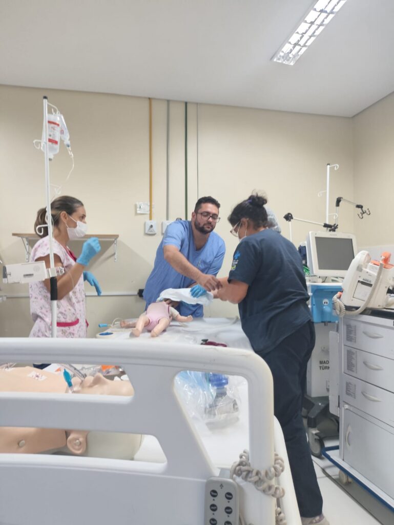 As equipes hospitalares precisam estar sempre a postos para atuar em situações de emergência. Por esse motivo elas participaram de uma simulação de atendimento a paciente em parada cardiorrespiratória. No simulado, foram usados bonecos de treinamento adulto e infantil.
